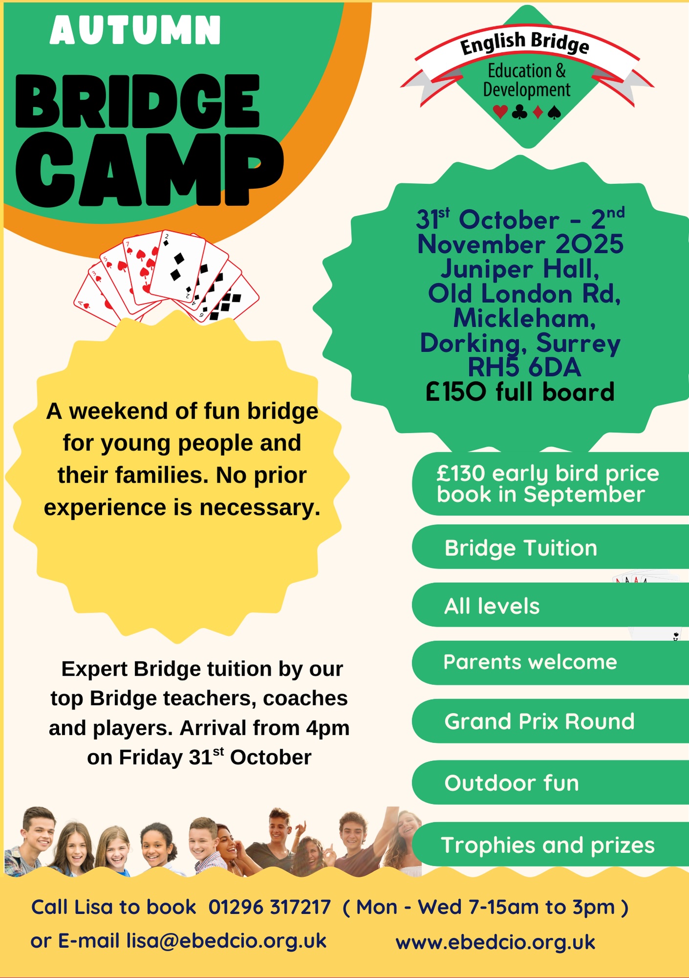 There are Spring, Summer and Autumn Youth Camps. The Autumn Youth Camp is 31 October - 2 November 2025 at Juniper Hall, Dorking Surrey RH5 6DA. All levels welcome including new players, and parents and grandparents can come too. See attached Flyer.