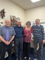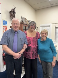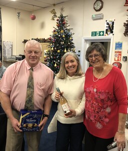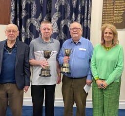 Our Championship Pairs competition finished on Wednesday 19 March and it is pleasing to see new names to go up on the board. Congratulations to Janice Mairs and Steve Walker who are the new champions. Here is a photo of them holding the trophy being congratulated by the President.