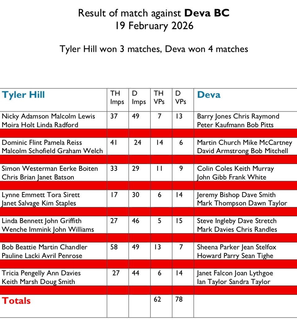 One of those (very welcome) opponents was Tyler Hill BC from Canterbury in Kent and recently they contacted us to arrange a re-match. We managed to put together seven matches of which Deva won four and, overall we came out on top by 78 VPs to 62. Well done everybody and particular thank to those from both clubs who helped to organise the match. Here are the full results: