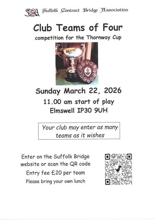 If you wish to enter, please complete the entry form - click HERE to see it. The entry fee for the Qualifying event is just £5/pair and Suffolk Bridge will pay the entry fee for the May 30 Final.